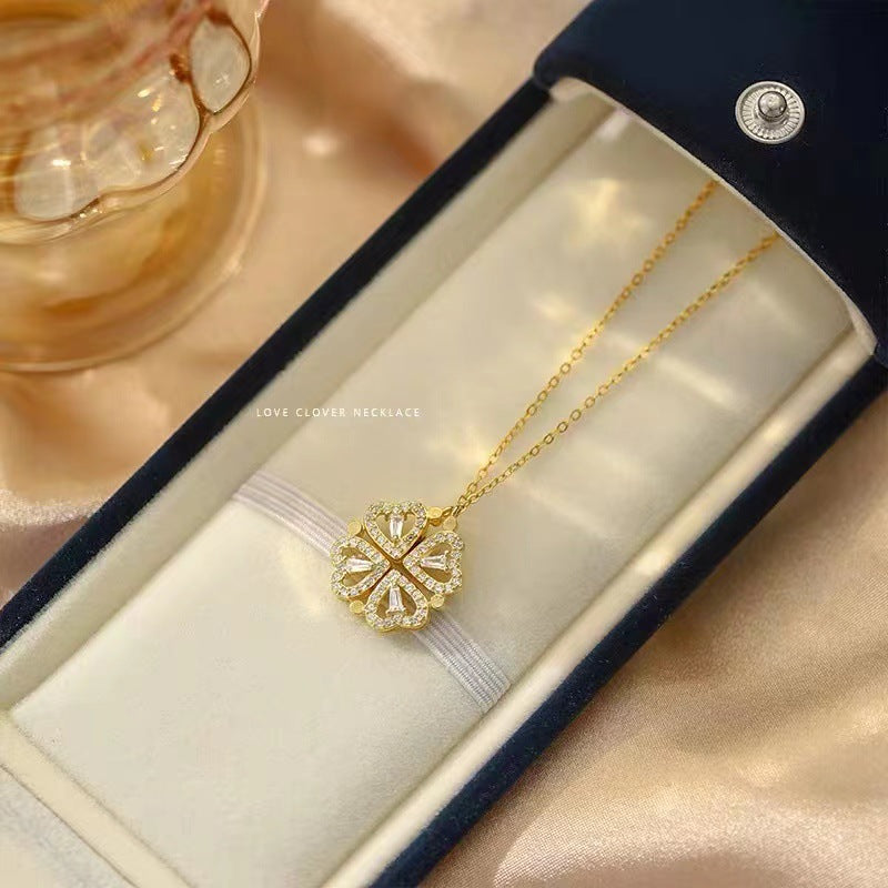 Een magnetische ketting met twee stijlen waarmee u moeiteloos kunt wisselen tussen een sprankelend klavertjevier en een elegant hartontwerp: twee looks in één met een simpele magnetische klik.